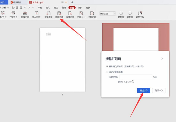 点击菜单栏上的删除页面,弹出窗口,然后自定义删除页面,输入需要删除的页面范围,点击确定。