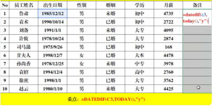 自动计算年龄公式:=DATEDIF(C3,TODAY(),"y")