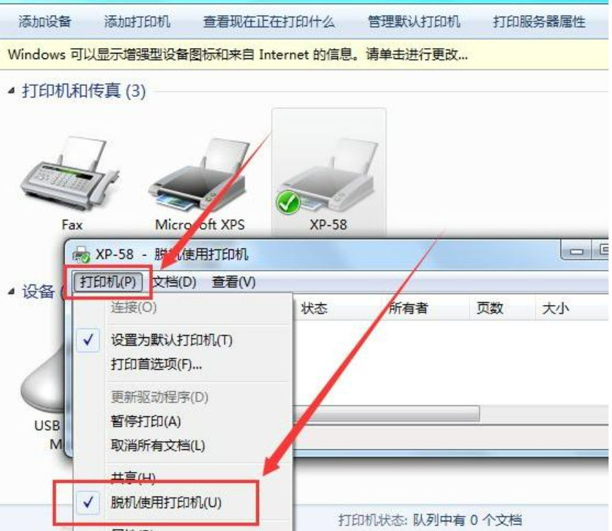 然后点击正在使用的打印机,把脱机使用打印机的勾选去掉;