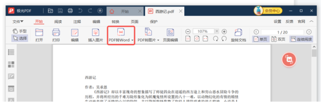 1、首先我们需要下载安装极光PDF,并用极光PDF打开需要转换格式的PDF文件,选择上方的“PDF转Word”功能。