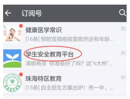 1、登录手机微信,在订阅号中找到学生安全教育平台。