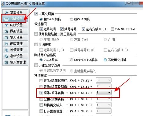 2、选择左侧的“按键设置”进入,选中“简体/繁体转换”选项打勾,这样就可以启用快捷键,使用图示快捷键进行简体和繁体切换。
