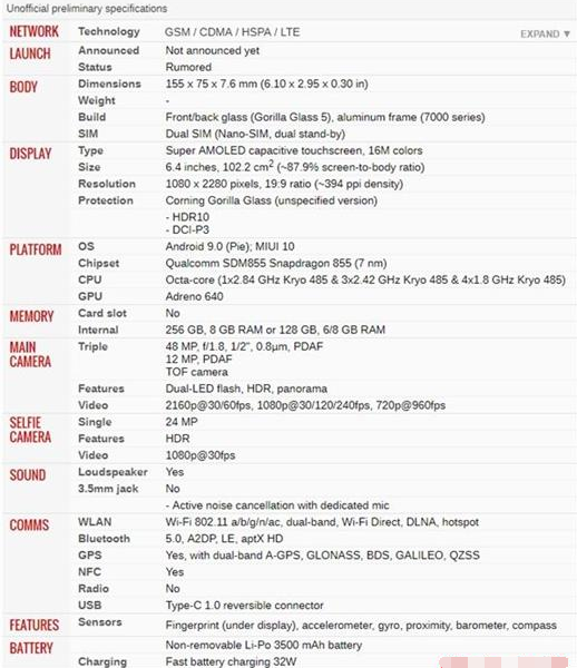 2、目前搭载的是高通最新处理器骁龙855处理器,GPU采用Adreno640,存储方面,小米9将使用6/8GB+128GB/256GB存储配置。
