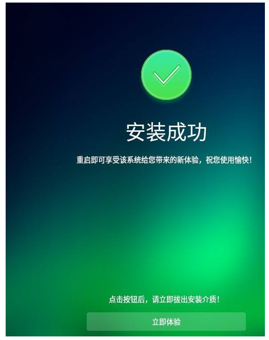 5.接下来会出现安装完成的提示窗口,随后拔出启动U盘,点击”立即体验“。