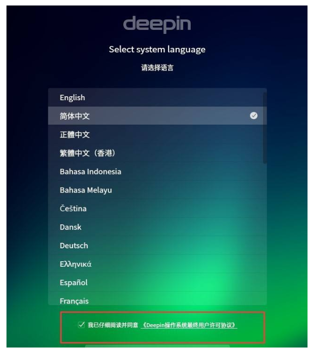 1.首先把对应的深度系统镜像文件拷贝进U盘当中,然后将U盘插到需要安装深度系统的电脑上。开机之后,在安装的首页上自行选择语言。
