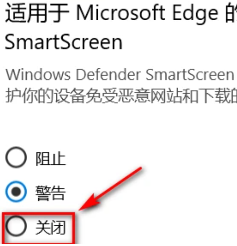7、点击“适用于Microsoft Edge的SMartScreen”,选择“关闭”。