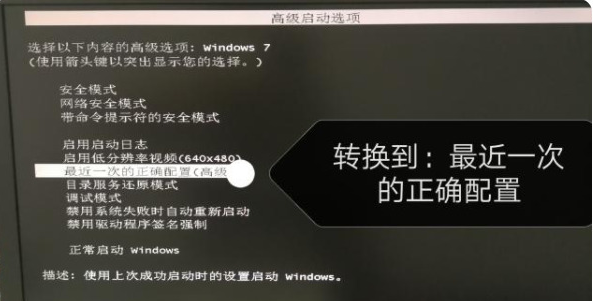 2、选择“最近一次的正确配置”,回车,即可解决这个问题。