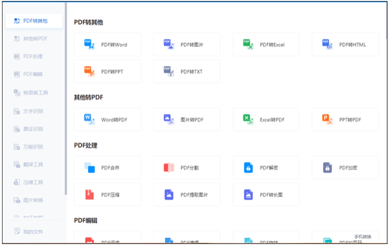 安装了全能pdf电脑端转换软件后打开,它支持PDF格式之间的相互转换,同时它还可以进行PDF处理与编辑,以及文字转语音、图片识别、文字翻译等功能。根据界面提示操作即可,很方便,点击上传PDF文件转换即可。