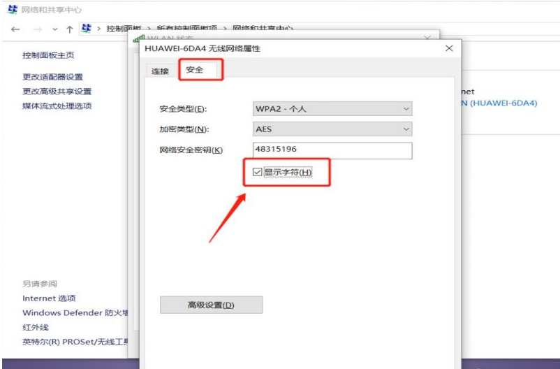2、然后在属性中选择安全,勾选上显示字符,这样就可以显示出wifi密码了。