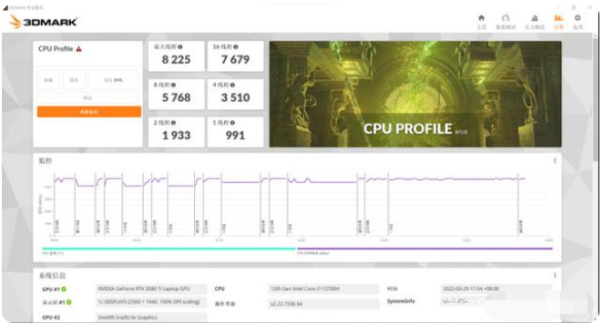 在3DMark CPU Profile项目中,处理器单线程分数为991、最大线程分数为8225。