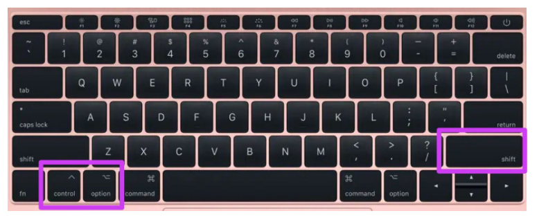 3、关闭电源时,同时按住 Control(键盘左侧)+ Option(左侧)+ Shift(右侧)约七 (7) 秒。