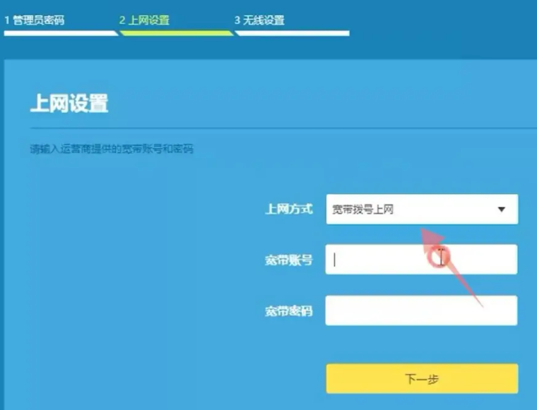5、在第二个上网设置的界面,如果是单独的光猫,就将上网方式选择为宽带拨号上网。