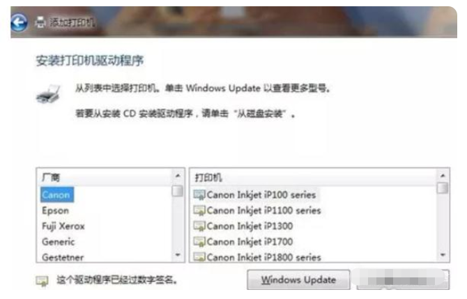 5、接着系统会弹出安装打印机驱动程序的界面,在下面的提示里面选择你的打印机型号即可。如果你的打印机型号比较特殊,可能需要事先从打印机官网下载相关驱动,然后再进行安装。
