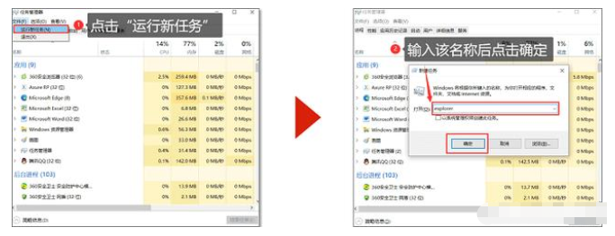 2. 点击“运行新任务”后,在弹出的名称框内输入“explorer”这个名称,然后点击确定,桌面图标就可以回来了、