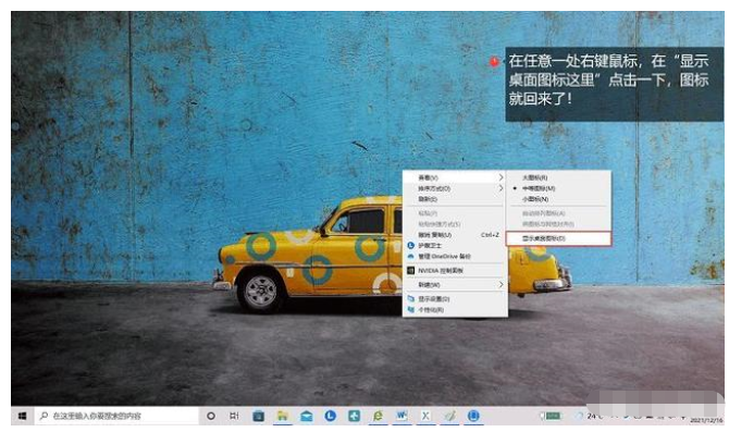 2.在桌面任意一处右击鼠标,勾选“显示桌面图标”即可。