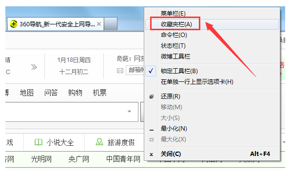 6、在下拉列表中选择“收藏夹栏”,浏览器中就会出现收藏夹栏。