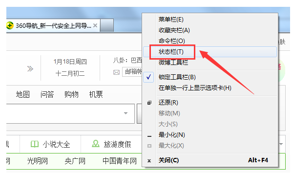 5、在下拉列表中选择“状态栏”,浏览器下方会显示当前页面的缩放级别。