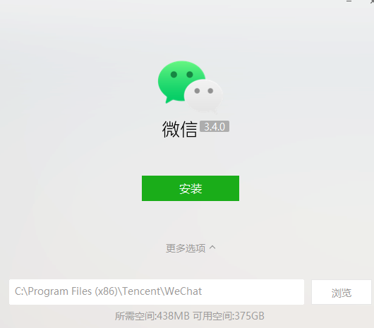 3、数据加载完成后,显示微信电脑版安装向导界面,点击“更多选项”(默认C盘路径),浏览更改安装路径文件夹。