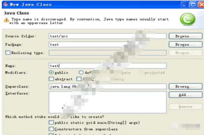 8、我们输入类名,比如输入 test,,然后单击finish即可。