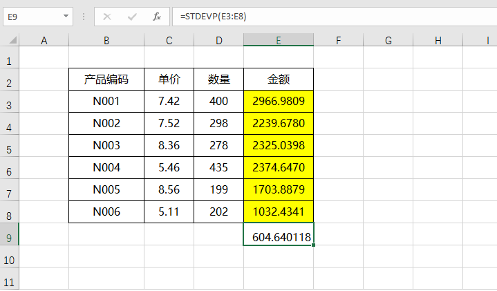 2、然后在单元格中输入“=STDEVP(E3:E8)”,按下回车键,标准差就计算出来了。