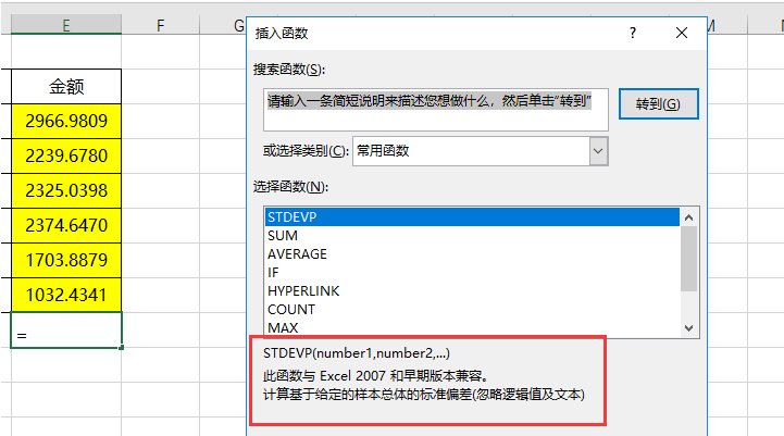 4、选择STDEVP函数,并点击确定。