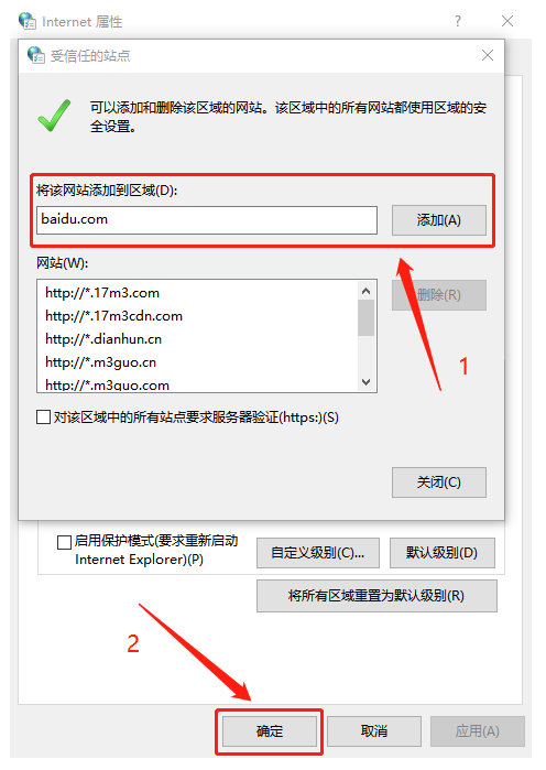 3、弹出受信任站点添加窗口后,将需要添加的网站地址输入到方框中,输入完成后点击“添加”键。添加完退出到属性页面后,再点击“确定”键保存设置即可。