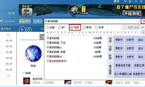 2、此时在搜索栏里输入歌名,在下面记得选无损,单击后面的搜索。