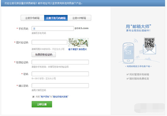 网易邮箱大师会跳转到网页端,会有三种的网易邮箱大师注册方式,可以选择较为简单的“注册手机账号邮箱”,输入自己的手机号,填写收到的短信验证码,填写设置的密码,注册就完成了。
