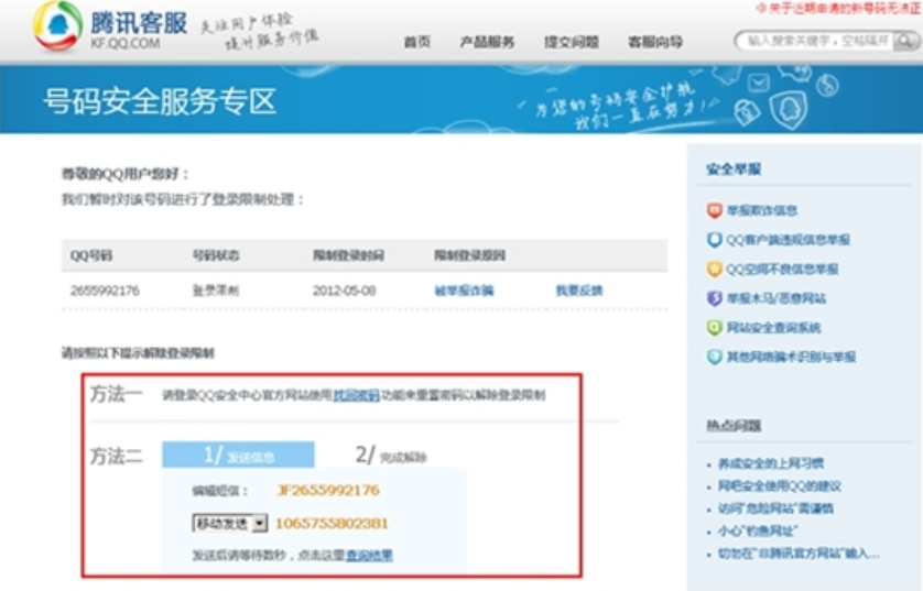 1、进入腾讯客服官网kf.qq.com,点击进入号码安全服务专区;