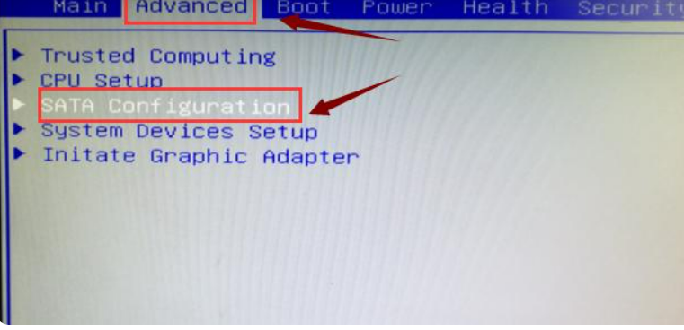 2、在进入到bios界面时,我们通过方向键切换到advanced选项,然后找到SATA Configuration,在这个选项中按下回车键进入。