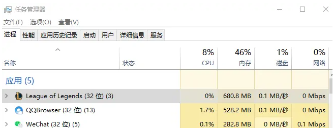 2、在进程中,选定“应用”中的“英雄联盟”即可。