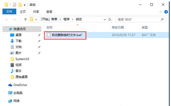 4、把桌面的.bat的文件复制到该文件夹下面,也就是开机启动文件夹中。这样每次开机后,系统将自动清理系统临时文件了。