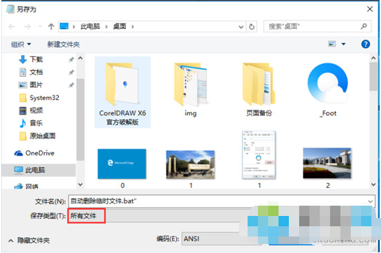 2、另存为文件名后缀以.bat结尾,下面的保存类型选择“所有类型”。保存好的文件先放在桌面。