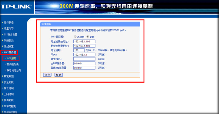 输入路由器默认地址进去管理页面,点击【DHCP服务器】——【DHCP服务】,完善以下信息即可开启: