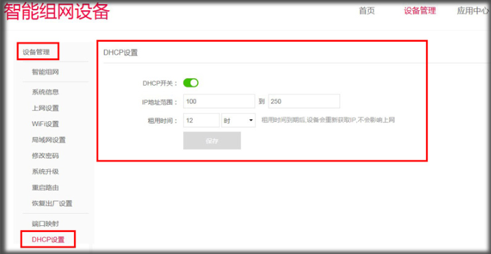 在路由器管理界面,点击【设备管理】——【DHCP服务设置】,填写以下的信息后点击保存即可。