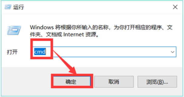 1、首先同时按下“WIN+R”键,打开运行窗口后输入“cmd”,点击确定。