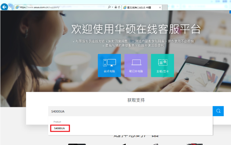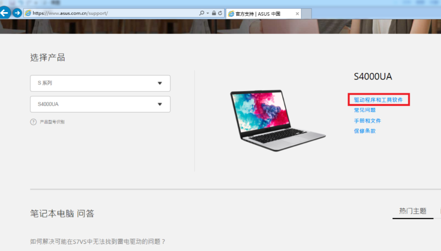 1、在www.asus.com.cn/support页面下方,直接选择产品类型和具体的型号,点击右侧的驱动程序和工具软件进入。