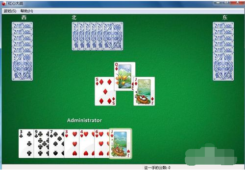 5、这一轮其他三家出方片牌,但是这时候我没有方片牌,所以可以出其他花色,这时候要出红桃牌让其他玩家得分,或出数值比较大的牌以免自己在之后出这些牌时得分。