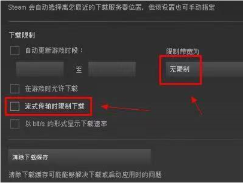 在steam内设置不限速度的情况下,取消掉“流式传输时限制下载”的选项,这样可以将全部网速投入游戏的下载中,但是这样可能会让原本的电脑在一段时间无法使用网络。