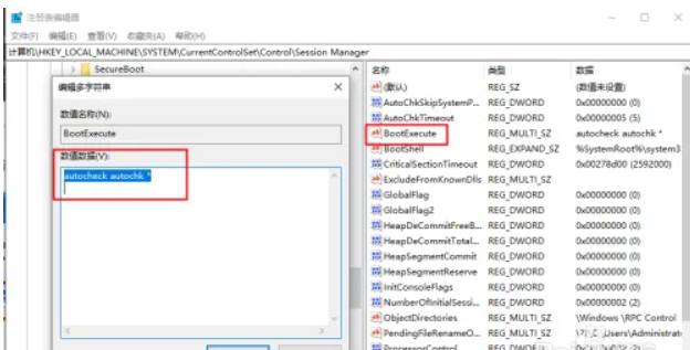 3.接着在右侧找到并双击打开【BootExecute】项,然后在弹出的界面中将数值数据设置为【 autocheck autochk *】,最后点击【确定】即可。