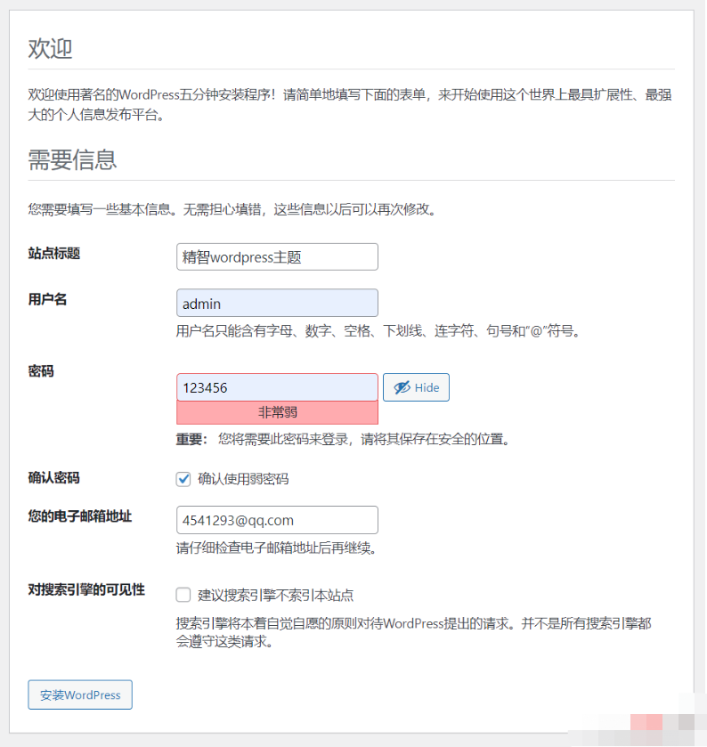 e、填写网站标题“精智wordpress主题”、用户名、密码、邮箱后点“安装wordpress”。完成安装。