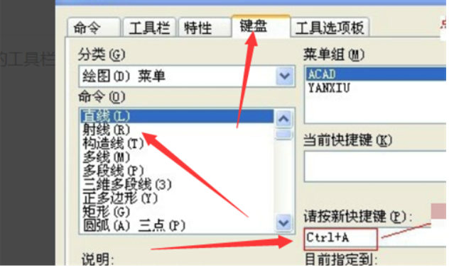 3、点击键盘,先要确定需要修改的命令,在子菜单下面找需要修改的命令,在新快键输入快捷键。