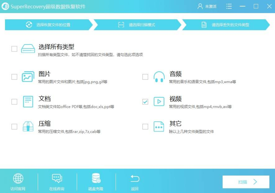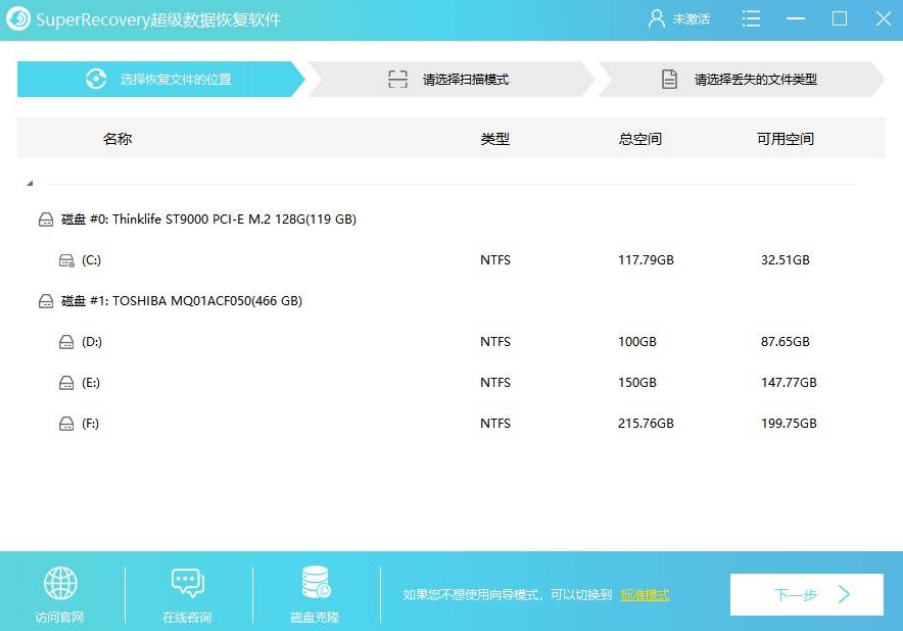 步骤1:首先,双击打开电脑上已经安装好的Superrecovery软件,并直接进入到软件的“向导模式”。我们需要做的就是在开始恢复之前,依次设置:需要恢复数据所在的位置、软件扫描的方式、需要恢复数据的类型等等。
