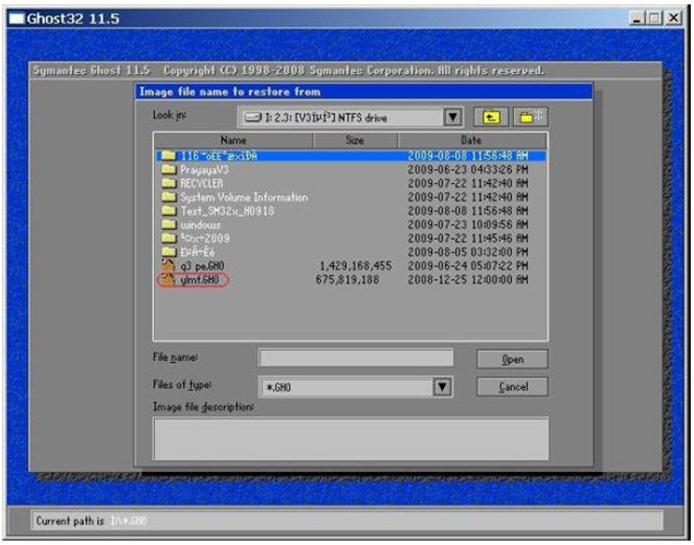 c.如上图,找到事先准备好的GHO文件(注意:Ghost文件要放在磁盘的根目录),选定后点open(打开),弹出界面如下图: