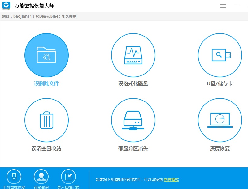 1.首先下载并安装运行万能数据恢复大师软件。在软件界面上选择“误删除文件”。