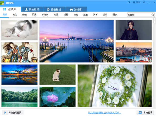 1,首先,我们就来说说360壁纸,它是360全新推出的壁纸客户端,360壁纸软件里面有风景、动漫、影视等十大类海量高清壁纸,用户可以通过壁纸搜索、图片分类寻找自己想要的壁纸,使用壁纸自动更换功能,让桌面壁纸随心更换。