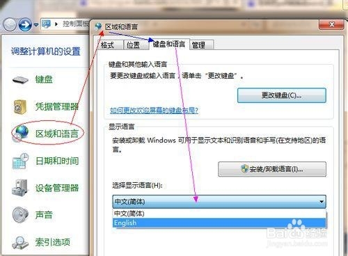 点击"开始"->"控制面板"->"区域和语言"->切换到"键盘和布局"选项卡.