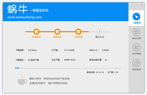 上述就是蜗牛一键重装系统使用方法的全部内容了,蜗牛系统重装工具不需要用到光盘也不需要用到u盘制作启动盘装系统,是最简单的安装方法了,没有光盘与U盘装系统过程的复杂,也不需要你有任何的电脑基础知识,简单轻松几个步骤就能解决的事情了,不可以貌取人哦!