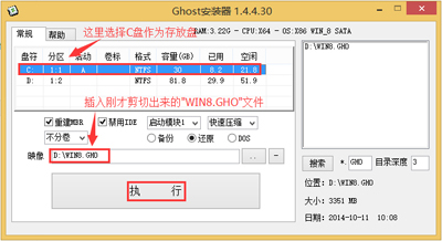 5、双击“安装系统.exe”,选择“C盘”(C盘为系统磁盘),插入映像文件“WIN8.GHO”,接着点击执行,如图所示: