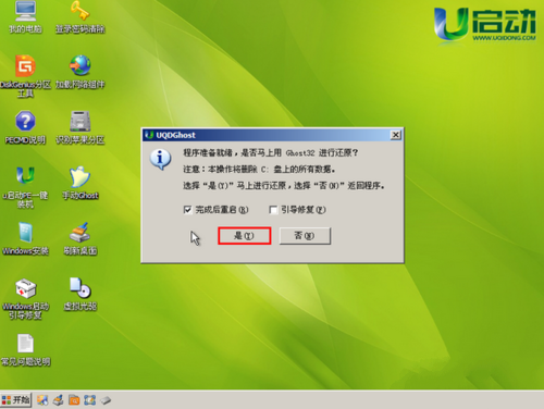 5、进入到winpe系统之后双击打开桌面上的“u启动pe一键装机工具”,打开之后我们会看到装机工具已经自动检测到了GHO镜像路径,我们就不用再去管它了,点击下面的”确定“,然后弹出窗口提示在”完成后重启“前打勾,点击”确定“。然后就开始漫长的等待了。。